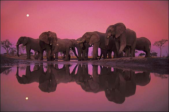巨人的黎明:自然歷史攝影師弗蘭斯·蘭亭1989年在非洲博茨瓦納的丘比國(guó)家公園拍攝的,當(dāng)時(shí)這些非洲象正沐浴在黎明的微光之下。
