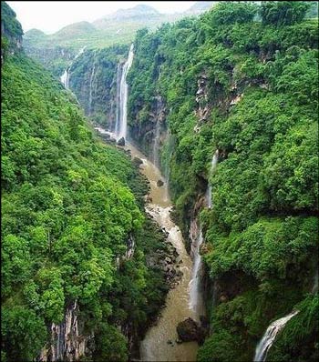 還有一個(gè)有特色的瀑布在貴州,一個(gè)叫馬嶺河的地方,那是一個(gè)峽谷,峽谷之間跨越一座大橋,在大橋上可以看見峽谷上無數(shù)的河水漫開流到峽谷里,一縷縷飄渺的瀑布懸掛在整個(gè)峽谷間,看圖片你就知道有多么漂亮。