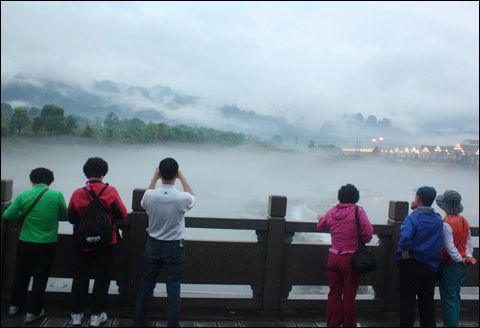 5月4日傍晚,一陣大雨過后,湖南武陵源景區(qū)出現(xiàn)“阿凡達(dá)”仙境,薄薄的水霧飄舞在索溪,遠(yuǎn)處百丈峽青山也被白霧纏繞,似夢似幻,恍若天然的山水畫,吸引了不少海內(nèi)外游客和當(dāng)?shù)鼐用耨v足觀看、拍照留念。
