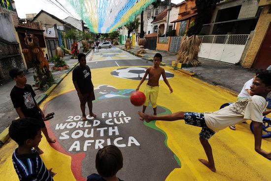 當(dāng)?shù)貢r(shí)間2010年6月3日,巴西里約熱內(nèi)盧,兒童在街頭踢足球。隨著世界杯的臨近,里約熱內(nèi)盧民眾用巴西隊(duì)隊(duì)服的顏色裝點(diǎn)城市的街道,以此來表達(dá)巴西人對(duì)這屆世界杯的期待,并祝愿巴西隊(duì)能在南非取得好成績(jī)。