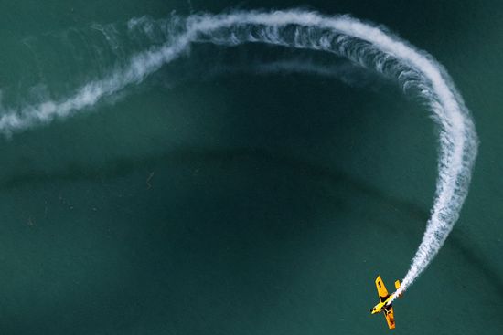 當?shù)貢r間2010年6月4日,加拿大,澳大利亞人馬特-豪架勢的飛機飛過湖面。當天是“紅牛飛行比賽”第二個訓練日。