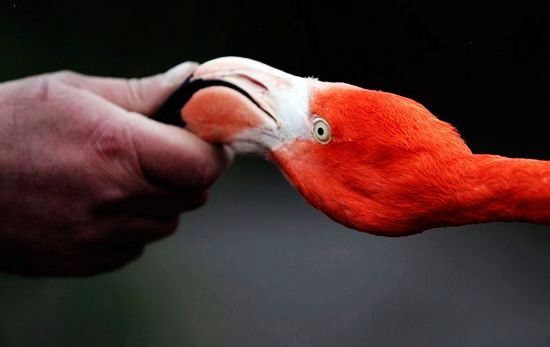 英格蘭北部地區(qū)切斯特動物園的飼養(yǎng)員捏住美洲紅鸛(Caribbean flamingo)的喙。作為體檢的一部分,美洲紅鸛正經(jīng)歷著10年來的首次測量、稱重,并被植入微晶片。