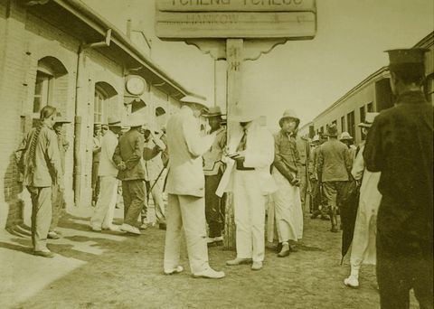 這是一個(gè)外國(guó)朋友照的照片。鄭州站的月臺(tái)上,旅客們?cè)谏相嵵?--漢口的火車。