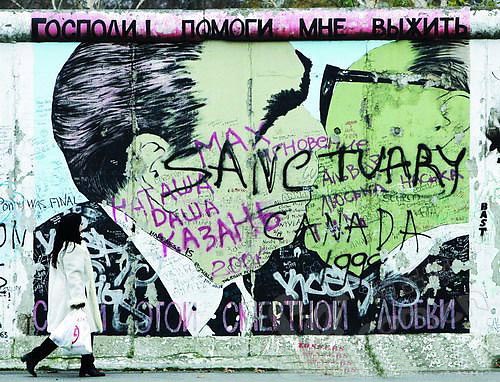 1989年11月9日,柏林墻倒塌。柏林墻的倒塌如同它的建立一樣讓人措手不及。一年后,來自世界各地的118名藝術(shù)家應(yīng)邀在東側(cè)墻壁上涂鴉,繪制出106幅作品,包括世界聞名的“Kiss of Death(死之吻)”、“Fraternal Kiss(兄弟之吻)”以及由Kinder創(chuàng)作的“Test theBest(實(shí)驗(yàn)最好的)”。1200米的“東面畫廊”是目前柏林墻殘余最長的一段,雖然德國政府花巨資對這僅存的柏林墻進(jìn)行維修,但是風(fēng)吹日曬,那些經(jīng)歷過血雨腥風(fēng)的涂鴉早已斑駁不堪。
