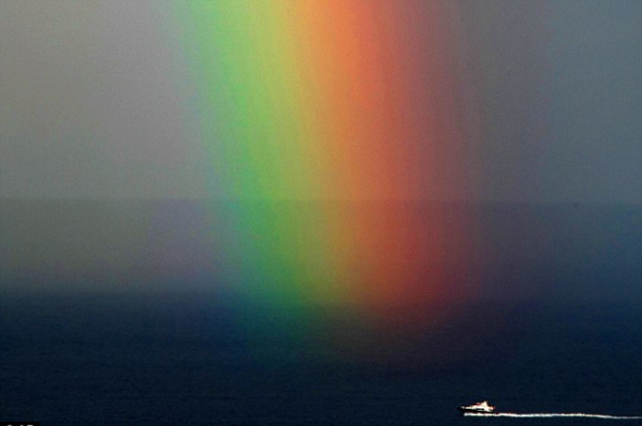 西赫農(nóng)拍攝這組照片時(shí)沒有采用任何技術(shù)手段進(jìn)行效果加工。以陰沉的天空和深藍(lán)的海水為背景,這個(gè)巨大的彩虹展現(xiàn)出令人敬畏的自然魅力,人類的飛機(jī)和游艇顯得非常渺小。