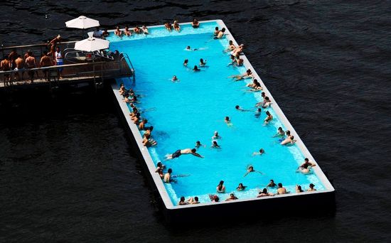 7月5日,炎熱的夏日,柏林人在漂浮在施普雷河上的水池里降溫。