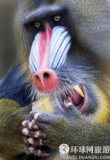 荷蘭動物園的一只山魈(西非洲產(chǎn)的大沸沸)在添冰激凌。