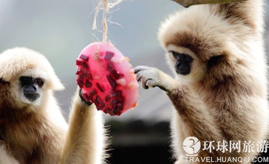 巴西圣保羅動物園的白爪長臂猿在吃冰鎮(zhèn)水果。