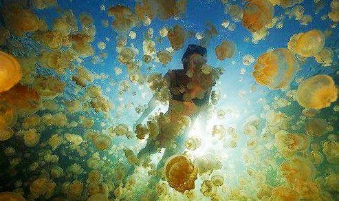 在帕勞的群島中,有很多島都有四面環(huán)山的內(nèi)陸湖,湖水沒(méi)有海水清澈,呈現(xiàn)暗綠色。帕勞的水母湖里有著全世界獨(dú)一無(wú)二的無(wú)毒水母。據(jù)說(shuō)水母湖的參觀是統(tǒng)一管理的,有時(shí)候,開(kāi)這個(gè)島的水母湖,一段時(shí)間以后,再開(kāi)另一個(gè)島的水母湖,這個(gè)就關(guān)閉起來(lái)讓那些受傷的水母休養(yǎng)生息,這樣,水母湖既為帕勞創(chuàng)造了可觀的旅游經(jīng)濟(jì),同時(shí),水母也得到了管理和保護(hù)。
