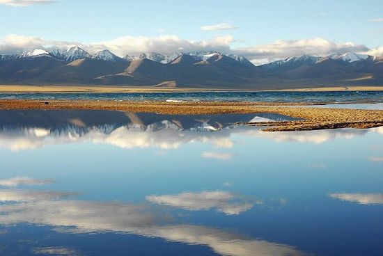 中國西藏自治區(qū)最大的內(nèi)陸湖,也是世界上最高的咸水湖。蒙語和滿語稱“騰格里諾爾”,藏語納木湖意為天湖。位于拉薩以北當(dāng)雄縣和那曲地區(qū)班戈縣之間。在念青唐古拉山主峰以北,距離拉薩240公里。是西藏第一大咸水湖,也是我國第二大咸水湖(在20世紀(jì)70年代以前為我國第三大咸水湖,自從羅布泊干涸后成為我國第二大咸水湖),世界海拔最高的大湖。