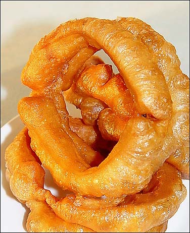 北京小吃中的焦圈,男女老少都愛吃,酥脆油香的味兒,真叫人吃不夠。北京人吃燒餅,常愛夾焦圈,喝豆汁也必吃焦圈。宋代蘇東坡曾寫過一首詩,相傳是中國第一首產(chǎn)品廣告詩:“纖手搓成玉數(shù)尋,碧油煎出嫩黃深,夜來春睡無輕重,壓褊佳人纏臂金!泵鞔顣r珍的《本草綱目•谷部》也有記載:“人少鹽,牽索扭捻成環(huán)釧之形,油煎食之!苯谷少A存十天半月,質(zhì)不變,脆如初,酥脆不皮,是千百年來人們喜愛的食品。