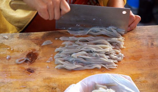 雞豆涼粉。鷹嘴豆,又稱雞豆,雞豆的淀粉具有板栗香味,豆粉加上奶粉制成豆乳粉,易于吸收消化,是嬰兒和老年人的營(yíng)養(yǎng)食品。將雞豆泡透磨細(xì)過濾成漿,然后煮熟為灰白色,倒入各種容器冷卻成形,便是雞豆涼粉。涼粉本為消暑食品,麗江雞豆涼粉除涼食外,還可熱吃。大街小巷賣涼粉的都有兩手準(zhǔn)備,以適應(yīng)顧客要求。晶瑩的粉片與紅辣椒、綠韭、花椒、青蔥、芥沫、酸醋等佐料腌拌起來,色香味俱佳,一碗入腹,開胃又爽口。
