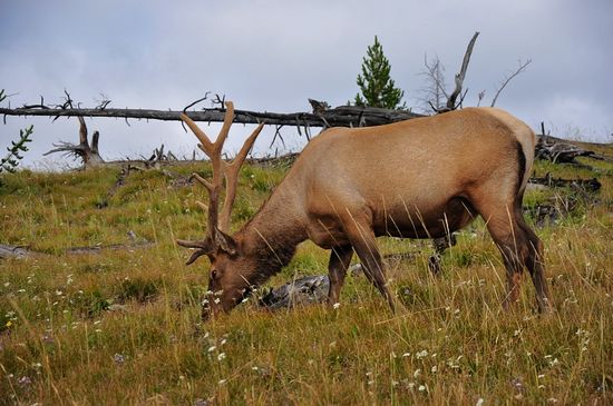 果然,在路邊的小山坡上看到了這頭鹿。當時很多游客端著相機在它旁邊拍照,可這位仍然淡定地低頭吃草。估計黃石里的動物是這種場面見多了,就好像明星被狗仔拍習慣了一樣的感覺。