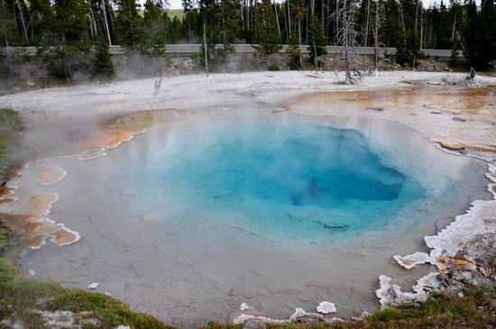 這個(gè)溫泉名叫“silex”,清澈透明的藍(lán)。黃石里的溫泉顏色各不相同,主要是因?yàn)槠渌V物質(zhì)不同造成的。
