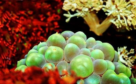 氣泡珊瑚很漂亮,不動的水都會出現(xiàn)很多氣泡,氣泡珊瑚的名就是這么來的。它們膨脹和擴張都需要光,白天張開時,看起來很像氣泡、珍珠或葡萄。泄氣時可以看見它們有一個硬的骨架。