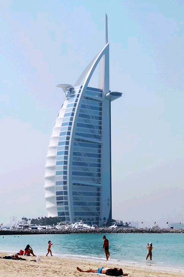“帆船酒店”,世界上唯一一個七星級酒店,位于迪拜延伸至阿拉伯海灣280米內處的人工島上,外形就像一塊迎風飄揚的風帆,塔高321米,一共有56層,曾是全球最高的酒店,是阿聯(lián)酋最奢侈的代表。除了別致的外形,酒店還有全年普照的陽光和阿拉伯神話式的奢華——躺在床上就可欣賞到一半是海水、一半是沙漠的阿拉伯海灣美景。