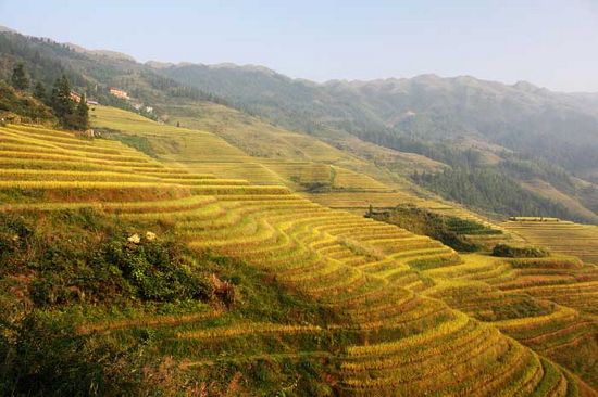 梯田不僅雄偉壯觀,而且景色美麗,一年四季的景色各異,魅力不同。春天,萬(wàn)物復(fù)蘇,梯田開始灌水,農(nóng)民們犁田、砌埂、削壁、灌水或牛拉,或人牽,點(diǎn)綴在如鏡般的梯田水面,勾畫出一幅生機(jī)盎然的田園風(fēng)光。夏天,層層梯田鋪青疊翠,蒼綠的禾苗,隨風(fēng)起舞,連著山崗的紅花綠樹,仿佛天地間渾然是一片浩瀚的綠海,令人感到神清氣爽。