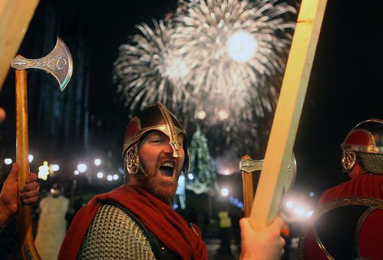 愛丁堡,蘇格蘭人穿著海盜服飾舉著火炬游行慶祝新年,千萬(wàn)人加入到了火炬游行的隊(duì)伍中。