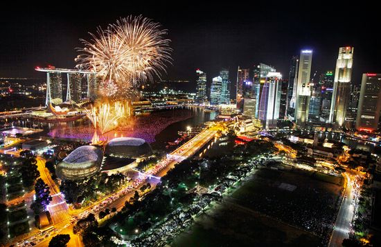 午夜到來之時(shí),煙花在新加坡金融區(qū)上空綻放,迎接新年。