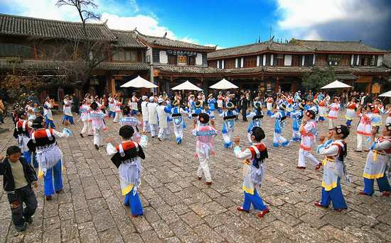 麗江古城街道依山勢而建,順?biāo)鞫O(shè),以紅色角礫巖(五花石)鋪就,雨季不泥濘、旱季不飛灰,石上花紋圖案自然雅致,質(zhì)感細(xì)膩,與整個城市環(huán)境相得益彰。四方街是麗江古街的代表,位于古城的核心位置,是一個大約4000平方米的梯形小廣場,五花石鋪地,當(dāng)?shù)氐募{西族人和游客總會在這里載歌載舞,自發(fā)地慶祝節(jié)日。