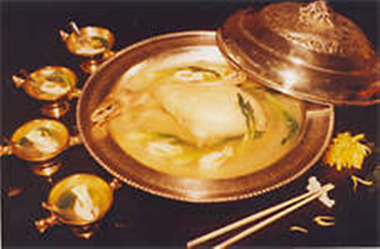 套四寶:俗話說:“寧吃飛禽三兩,不食走獸半斤”。 集兩禽或三禽為一體烹制菜肴的,非常少見,“套四寶”可稱為中國菜肴中的絕活。這道菜的絕在于集雞、鴨、鴿、鵪鶉之濃、香、鮮、野、四味于一體,四只全禽層層相套,個(gè)個(gè)通體完整,無一根骨頭。這道菜用青花細(xì)瓷的湯盆端上,食客看到的上一只體形完整、浮于湯中的全鴨,色澤光亮,醇香撲鼻。食完鮮香味美的鴨子后,一只清香的全雞便映入眼簾。雞肉吃完后,滋味鮮美的全鴿又出現(xiàn)在面前,最后又在鴿子肚里露出一只體態(tài)完整,肚中裝満海參丁、香菇絲和玉蘭片的鵪鶉。一道菜肴多種味道,不肥不膩,清爽可口。清蒸原湯醇厚鮮香,營養(yǎng)豐富,回味綿長,深受食客的好評。
