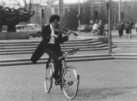 德國(guó)呂貝克的克里斯蒂安·亞當(dāng)(Christian Adam)從4歲開(kāi)始學(xué)騎自行車(chē),1970年開(kāi)始學(xué)習(xí)拉小提琴。從那時(shí)起,他就將自己的這兩項(xiàng)愛(ài)好結(jié)合起來(lái),最終打破了世界紀(jì)錄。目前,他倒騎自行車(chē)?yán)√崆俚氖澜缂o(jì)錄是37.56英里(約合60.45公里),時(shí)間為5小時(shí)零9分鐘。