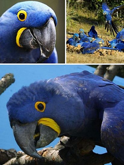 在南美洲中、東部林區(qū)可以看到藍(lán)紫金剛鸚鵡(Hyacinth Macaw)的身影。這種美麗的動(dòng)物是世界上體型最大的會(huì)飛的鸚鵡,最大體長可達(dá)39英寸(100厘米),翼展可達(dá)56英寸(140厘米)。藍(lán)紫金剛鸚鵡幾乎通體藍(lán)色,它的其他顯著特點(diǎn)是:翅膀下面長著黑色羽毛、眼睛一圈較小范圍內(nèi)和大大的嘴巴下長著對(duì)比鮮明的黃色羽毛。