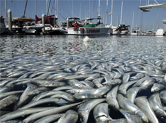 美國加州洛杉磯以南的海灣區(qū)突然出現(xiàn)數(shù)百萬條死魚,包括鳳尾魚、鯖魚、沙丁魚和其它小魚;生物學(xué)家解釋說,那些魚可能是被暴風(fēng)雨趕進(jìn)封閉的碼頭區(qū),因為缺氧死亡。
