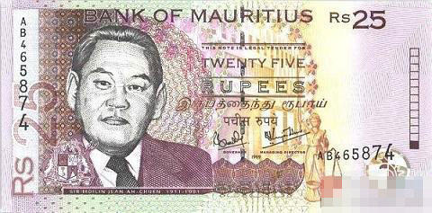 華人部長(zhǎng)朱梅麟,肖像被印在25元盧比(人民幣1元換4.5盧比)的正面。朱部長(zhǎng)的祖籍是廣東梅縣客家人,在抗戰(zhàn)時(shí)號(hào)召毛華回國(guó)救亡,呼吁毛華捐獻(xiàn)外匯支援中國(guó)政府。1970代初期建議毛里求斯政府發(fā)展加工出口業(yè),以免過于依賴旅游和蔗糖,為毛里求斯的今天作出了重大貢獻(xiàn),因而政府感念他,將其玉照印刷在鈔票上以茲紀(jì)念,朱部長(zhǎng)已經(jīng)于1991年過世。