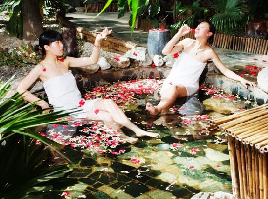 天體浴是花都溫泉源于自然的一個主題區(qū)域,充分體現(xiàn)花都“水之靈、花之魂,物我交融、天人合一”的自然、放松、生態(tài)、休閑之“健康經(jīng)營觀”,一方天地,讓遠(yuǎn)離紅塵的你我,盡情聆聽花開花落的聲音,體驗來自心靈深處的那一份感動。男女分浴,籬笆相隔,符合中國消費習(xí)慣,聞其聲不見其人,讓人恍如夢中,更平添朦朧縹渺之感。男方女圓的更衣室表達(dá)了其各自的性別符號,自高而下的水瀑布平分兩區(qū),體現(xiàn)了男女平等,也是聯(lián)系兩性的一條紐帶,整體突出返璞歸真、天人合一。