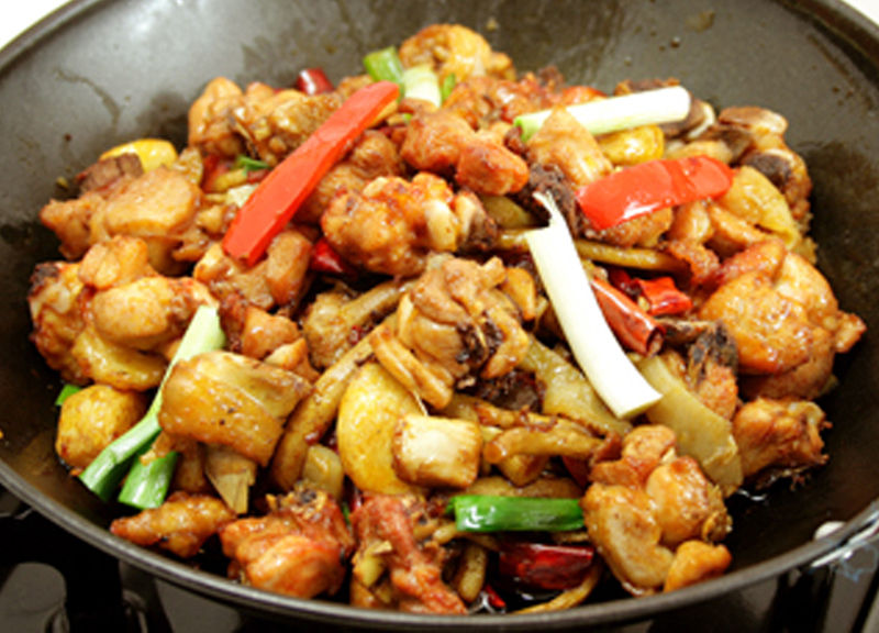 。病徨伬溆蜔焙,稍稍晾涼,下蒜瓣,姜片,大蔥(大蔥干了就撈出來(lái)不要)炒香,加入調(diào)好的醬料再炒香,再下雞塊青花椒一起炒,開小火翻炒40分鐘,(為避免糊鍋,油可以多點(diǎn)),加黃瓜和甜椒,藕,土豆片再炒,炒到黃瓜和甜椒斷生,撒上孜然粉翻炒下,就可以調(diào)味起鍋了。