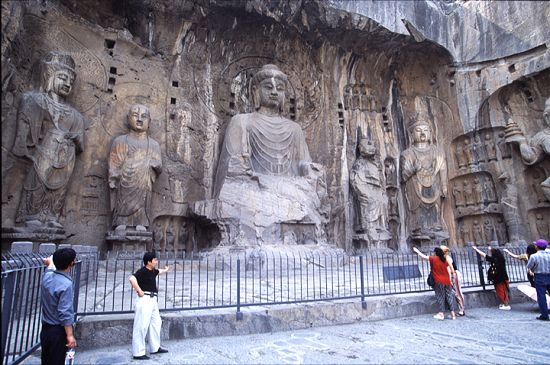 龍門石窟中另一個著名洞窟是賓陽洞。這個窟前后用了24年才完成,是開鑿時間最長的一個洞窟。洞內(nèi)有11尊大佛像。主像釋迦牟尼像,高鼻大眼、體態(tài)端祥,是北魏中期石雕藝術(shù)的杰作。