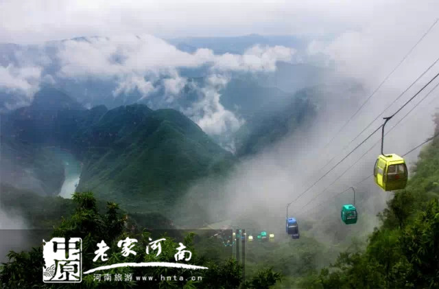 青天河登山索道,全長886.6米,高差475米,角度44.6°,兼具游覽和交通雙功能,為游客提供了新的游覽途徑。在悠揚的音樂聲中沿山勢緩緩而上,佛耳峽、觀音峽勝境便逐漸盡收眼底,東遙峭壁如削,南瞰山水一色,西眺丹水蜿蜒,北視群峰千疊,真可謂是“橫看成嶺側成峰,遠近高低各不同”。索道的動與山石的靜相結合,變幻萬千。抵達山巔,在探尋大自然鬼斧神工的同時,可以盡情飽覽靳家?guī)X一年四季的無限風光。
