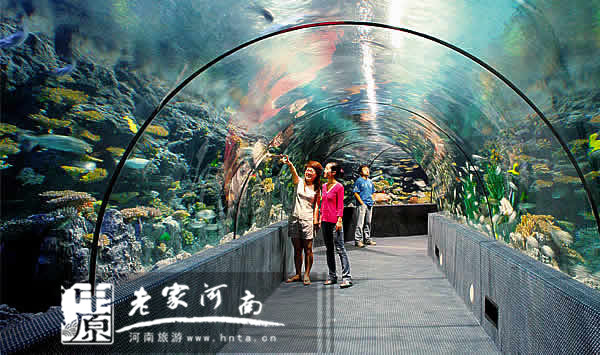 鄭州海洋館內最令人叫絕的是,海底隧道館有一條長約70米的海底隧道,游客們在海底隧道里行走時,不僅能真切地看到鯊魚、鰩魚等大型海洋魚類在頭頂、四周游動,而且能欣賞到大型的“美人魚”表演。