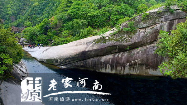 龍?zhí)稖纤`山秀,石奇崖險,頗饒登臨之趣。整個峽谷兩側(cè)是花崗巖山體,一色的蒼青如黛,更顯巨石千姿。大龍?zhí)陡浇囊粔K巨石酷似一條鱷魚頭正伸入水中啜飲,游人稱之為“鱷魚戲水”;