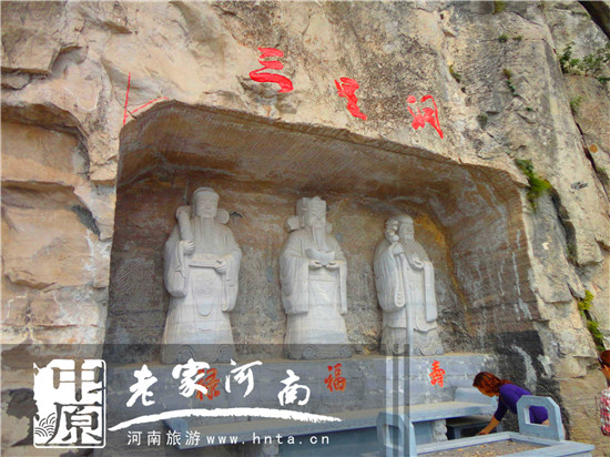 三星洞位于御馬峰下,絕壁石雕而成。中國歷來有“五福壽為先”的說法,人們常用“福如東海,壽比南山”,來祝福長輩健康長壽。為了迎合人們追求吉祥幸福、健康長壽的愿望,道教創(chuàng)造出了福、祿、壽三星的形象,“三星高照”,也就成了中國最為流行的一句對別人祝福的吉祥用語。 福、祿、壽三星崇拜,來源于中國遠古對星辰的自然崇拜。它們的原型,均為星宿。壽星,又叫南極老人星,位于天狼星之南。主管天下一切人等的壽命,成為中國人崇拜的壽神。福星即木星,是金、木、水、火、土五大行星中的一顆,中國古代又叫“歲星”。木星成為福星,與中國古代的天文歷法以及與此相關的民俗有很大的關系。古人將木星在天空中自北向西、南、東的運行劃分為十二段,稱“十二次”,又稱“十二宮”。木星圍繞太陽公轉(zhuǎn)的速度,正好是地球的十二分之一。也就是說,木星每前進一宮,就代表了地球上的一年,所以木星也被稱為“歲星”。由于木星標志著舊的一年的結(jié)束和新的一年的開始,所以它很早就成為人們在年終辭舊迎新時祭祀的對象。人們祈求歲星能夠給新的一年帶來好運、平安和健康,于是歲星就順理成章地成為了降福的福星。祿神信仰同樣來源于原始的星辰崇拜,民俗中又稱為“文昌帝君”、“祿星”等!妒酚·天官書》中說:“斗魁戴匡六星曰文昌宮:一曰上將,二曰次將,三曰貴相,四曰司命,五曰司中,六曰司祿。在斗魁中,貴人之牢。”其中的司祿, 就是專管人間功名利祿的祿星?婆e制度盛行以后,考取功名,成為古代士子們實現(xiàn)其報效國家、光宗耀祖的惟一途徑。于是,主管人間爵祿的司祿星,就成了主宰士人命運的神靈,天下的讀書人無不對它頂禮膜拜,奉若神明。 河南省旅游資訊有限公司 主辦