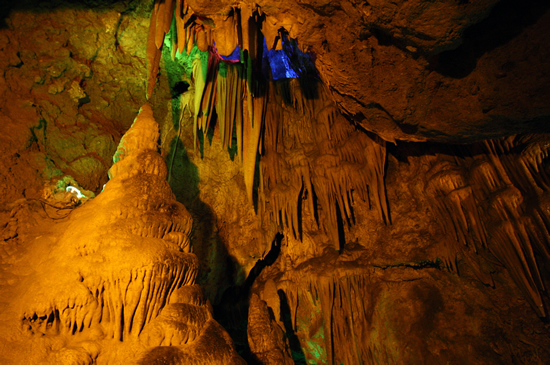 這里的又一看點叫做"情侶石",是兩細小石筍經(jīng)漫長時間連合在一起而成的,仿佛一對熱戀的情侶相互依偎,它的位置就在"千年一吻"同側(cè)向前的2.5米處。"情侶石"的右前方是一根高1.2米的石筍,圓身尖頂,清晰可辨11個層次,頗有伊斯蘭教寶塔的建筑風(fēng)格。"情侶石"正對的洞壁上生長的石旗則是片狀鐘乳石,它是沿洞頂曲折的石縫的流水沉積而成的,形狀像迎風(fēng)招展的旗幟。