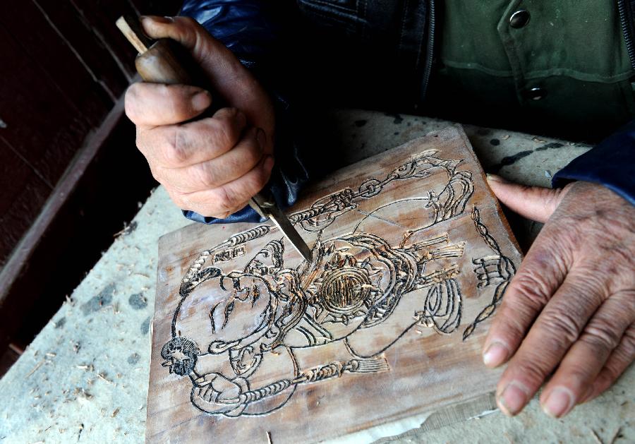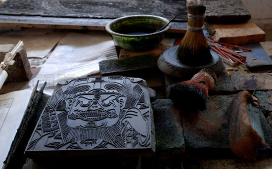 印版選用上等堅(jiān)實(shí)的梨木進(jìn)行刻版,刻前先用植物油涂于木板表面三到四遍,自然涼干后,再用頂沸的熱水沖洗。然后用特制刮刀刮去木板表面浮油,藝人稱之為“熟版”。 木板雕刻工具早年多為自行制作,有刻刀、凈縫刀、文章銼、鞏銼、刮刀、鏟刀、敲錘等二十余件。后來,雕版師傅也在使用成套的專用雕刻刀。