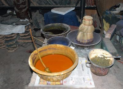 朱仙鎮(zhèn)木版年畫印刷用色也相當(dāng)講究。藝人們運(yùn)用傳統(tǒng)的炒、熬、濾等多道配色工藝,精心炮制。使年畫色彩更加鮮艷,絢麗多彩。他們在綠、紫色中加入白礬、石灰。紫、綠兩色要充分發(fā)酵,調(diào)制時(shí)要調(diào)起泡沫,色彩才沉穩(wěn)、耐看、有韻味。還將色中加入殘剩茶葉水,晾畫時(shí),才互不粘連等等。