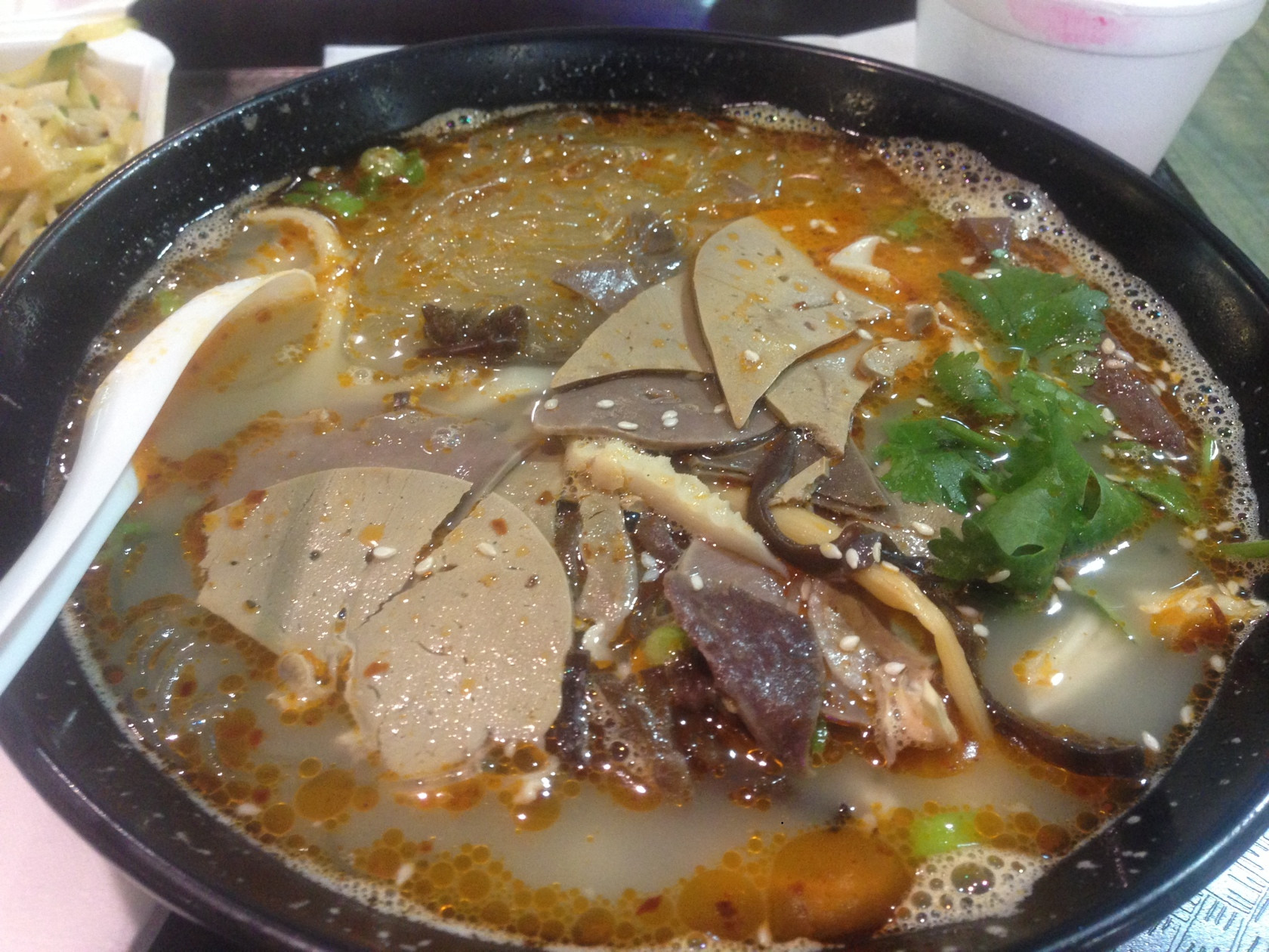 魯山羊雜湯的做法:取羊雜中口感最好,最有嚼頭的腸、肚;由于用羊肉湯會(huì)有很重的羊肉味道,而且成本會(huì)比較高,所以采用豬骨頭燉湯,湯呈乳白色,鮮香而不膩;湯中再加入梅干菜和香菜作配料,味道更加誘人。