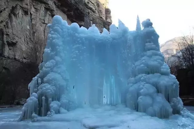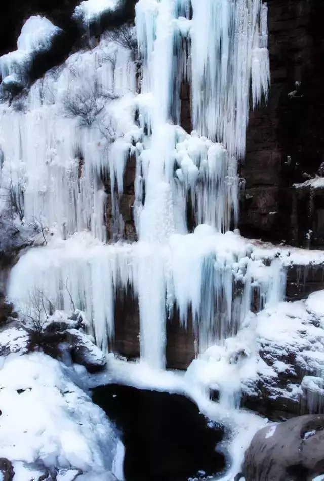夏日飛在云上的瀑布,冬日凝成百丈冰,剛勁凌厲,遠(yuǎn)遠(yuǎn)看去如一條白色的綢緞,掛在山間。