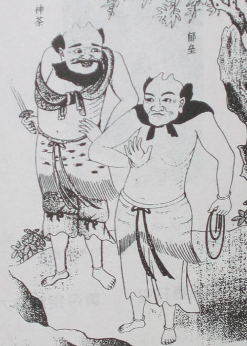 據(jù)漢代《河圖括地象》記載:桃都山有大桃樹(shù),盤曲三千里。上有金雞,日照則鳴;下有二神人,左神荼,右郁壘。相傳,天帝怕鬼怪下山到人間作祟,派了兩個(gè)神將去把守,一個(gè)叫神荼,一個(gè)叫郁壘。這兩個(gè)神的名字有特別的念法,神荼要念“伸舒”,郁壘要念“郁律”。兩員神將專門監(jiān)察鬼怪的行為。發(fā)現(xiàn)哪個(gè)鬼怪為非作歹,便用草繩捆起來(lái)送去喂老虎。五龍口民間相傳:“小鬼怕雞叫”。黎明時(shí)分,桃都山的神荼、郁壘專捉不祥之鬼。雄雞啼叫,嚇得魑魅魍魎統(tǒng)統(tǒng)奔逃,旭日才敢紅著臉緩緩升起。傳說(shuō),后羿上射九日,下殺怪獸,是人們心目中的英雄,但因射殺了天帝的兒子,故雖貴為天神卻不得善終,被小人寒浞雇兇用桃都山的桃木棍擊死。從此,桃木也就具有了避邪的功能。古時(shí)候,人們逢年過(guò)節(jié)總要在大門上懸掛桃枝,有的還要畫上神荼、郁壘等一些吉祥的符號(hào),稱之為“桃符”。宋代王安石詩(shī)云:“千門萬(wàn)戶瞳瞳日,總把新桃換舊符”,就是這個(gè)意思。