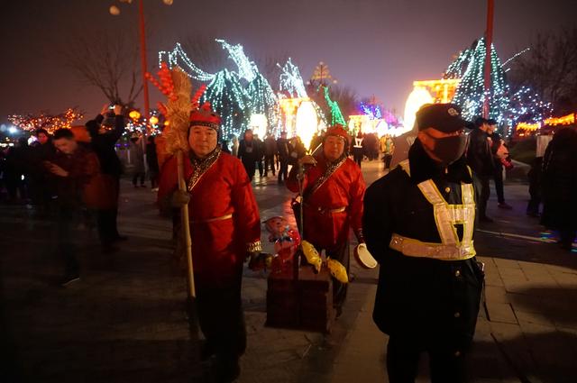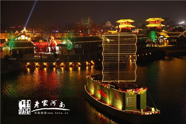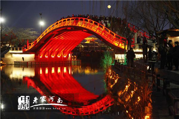 清明上河園的虹橋上,人影花燈映月明。