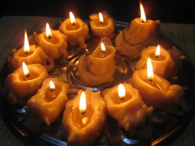 做法是先用開水燙面,和面,面一定要有硬度,否則做的燈會癱軟掉。等面和好了,感覺硬度也夠了,就開始做燈了。要捏成各種形狀。最主要的有兩種形狀:一種是捏成碗盞形;另一種是捏成上粗下細,中間有碗,像倒掛金鐘一樣形狀。捏好后上鍋蒸熟,然后在中間放上豆油,再在里面插上燈芯子,面燈就做好了。