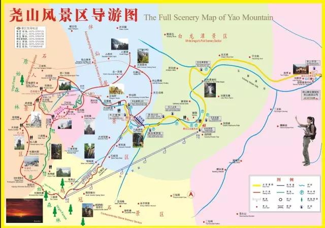 山門→迎鳳樹→堯山索道→飛云棧道→攬勝臺→玉皇頂→經(jīng)滑道→青龍背→白牛城口→通天門→九曲瀑布→山門(游程約5個小時左右)