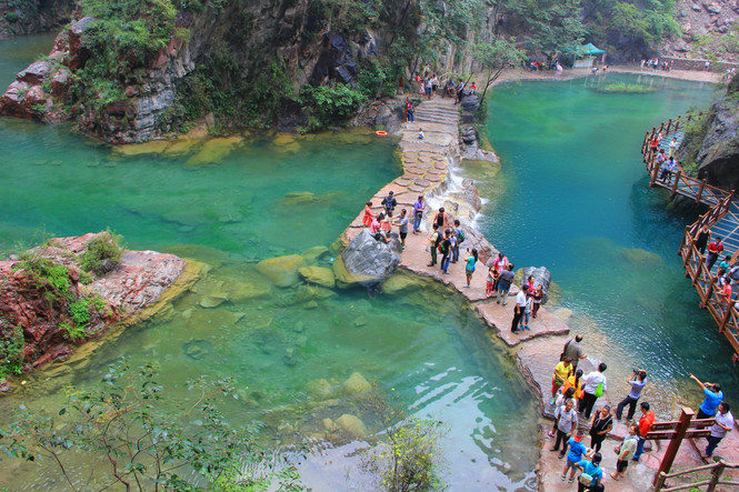 赤紅色的紅石峽集秀、幽、雄、險于一身,有“盆景峽谷”的美譽,峽谷里溫度保持在25度左右,夏天也是涼爽宜人。潭瀑峽、泉瀑峽更是三步一泉、五步一瀑、十步一潭,還有落差314米的華夏第一大高瀑——云臺天瀑,能讓人切身領(lǐng)略“飛流直下三千尺,疑是銀河落九天”的意境。