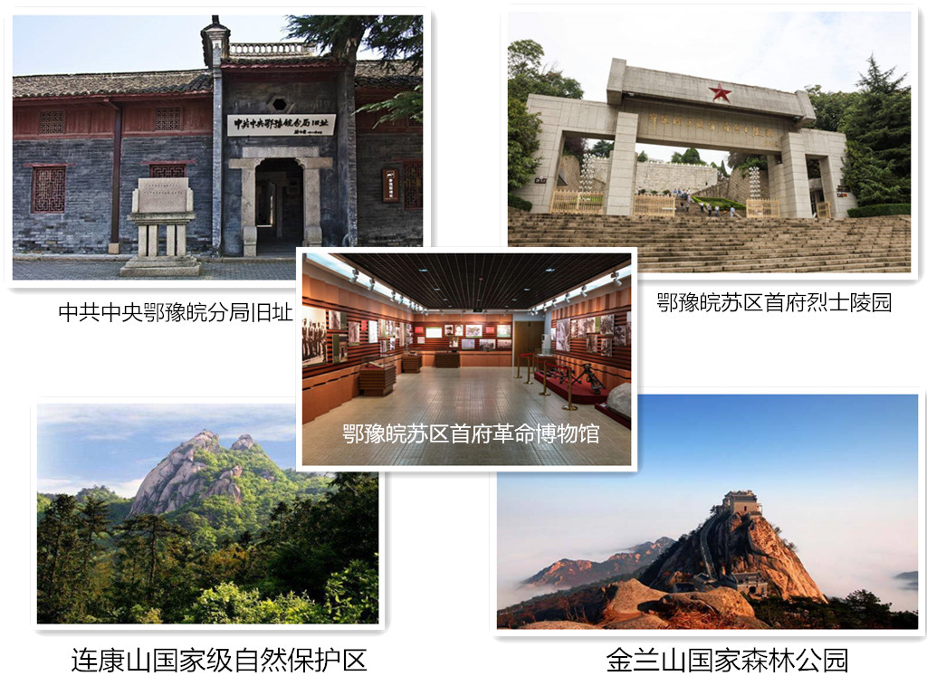 鄂豫皖蘇區(qū)首府烈士陵園、中共中央鄂豫皖分局舊址、鄂豫皖蘇區(qū)首府革命博物館、連康山國家級自然保護(hù)區(qū)、金蘭山國家森林公園