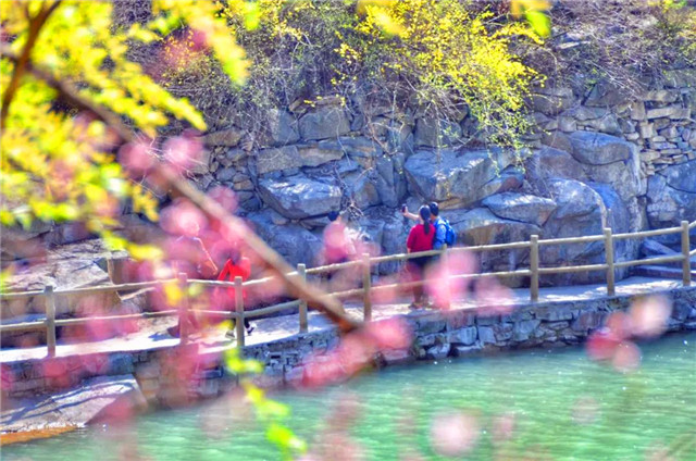 青山綠水,倒影幽幽,偶爾探出頭的桃花和連翹,此時,更顯得俏皮可愛。