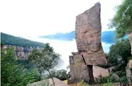 這塊神奇的巖石,高36米,寬9米,是黛眉山的一個特殊地質(zhì)現(xiàn)象——崩塌,山體因各種風化作用而開裂崩塌,只有中部一角支撐著整塊巨石,使它得以屹立萬年不倒,從而形成了獨特的奇觀。