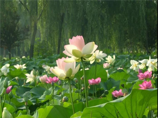 國(guó)花園春有牡丹,夏有荷,荷花,是洛陽(yáng)入夏的前哨。每年六月初,國(guó)花園內(nèi)的荷花就會(huì)相繼盛放,顏色淡雅,大小各異。湖里的荷花追上夏的腳步,牟足了一季輪回的勁兒,開(kāi)得熱烈而恣意。清雅的荷花,湖中的小魚(yú),好一幅田園生態(tài)圖....